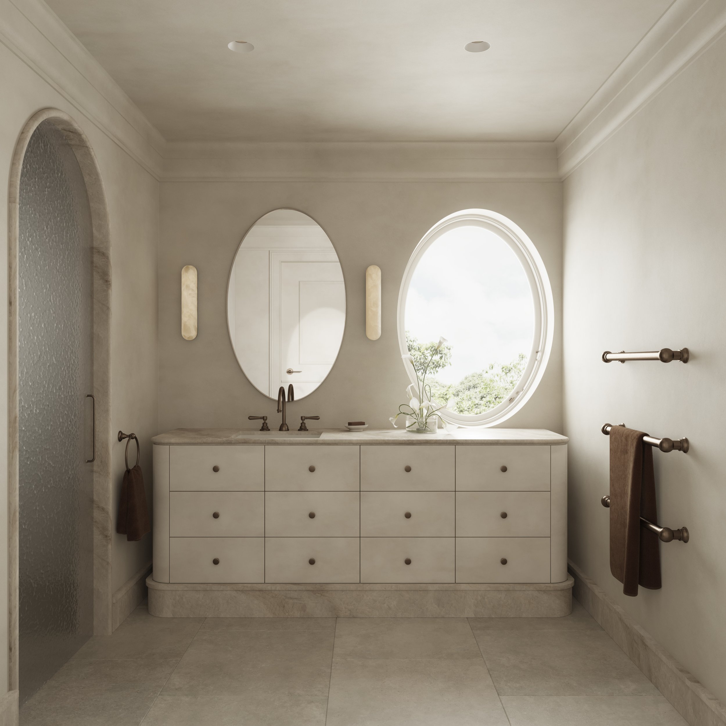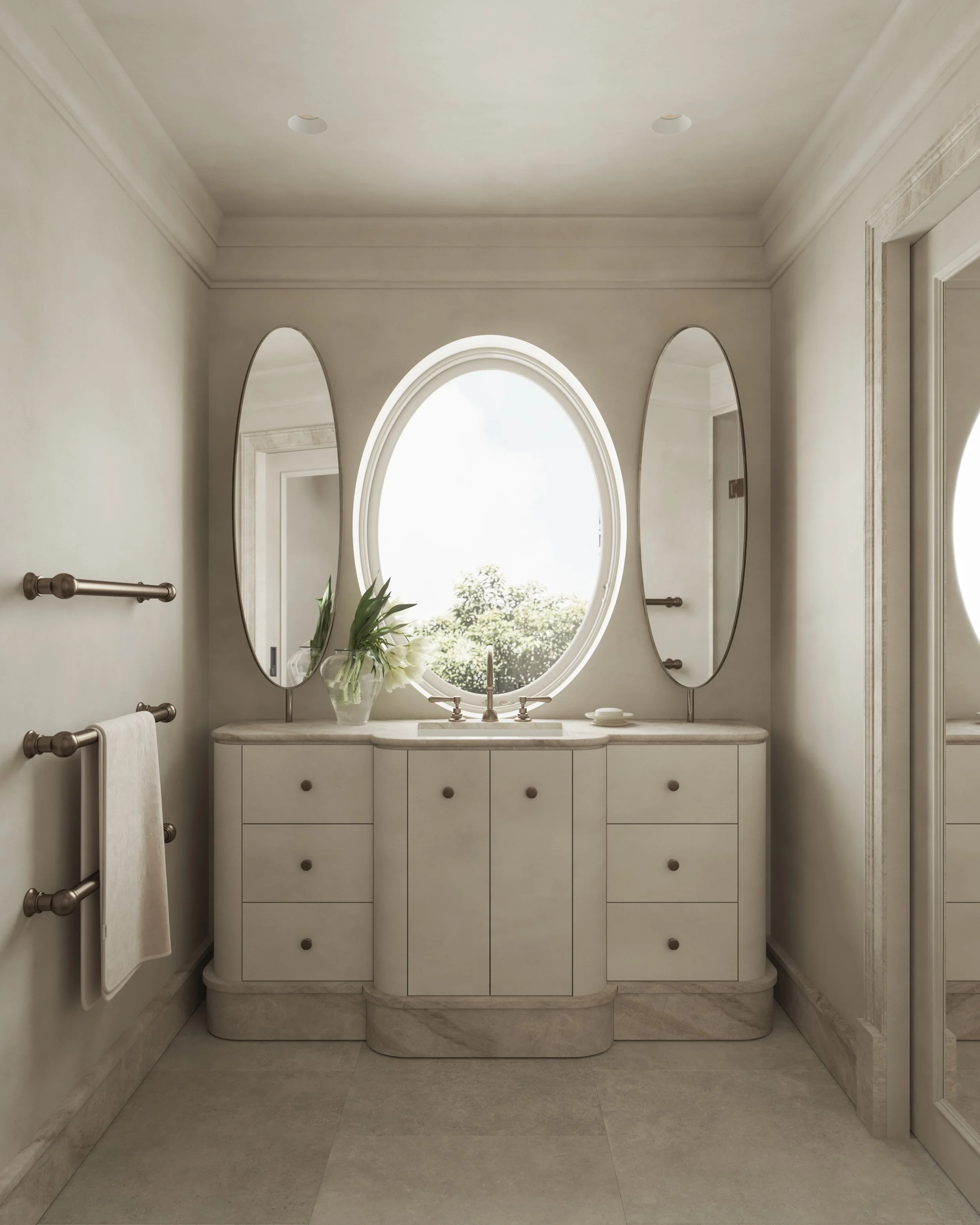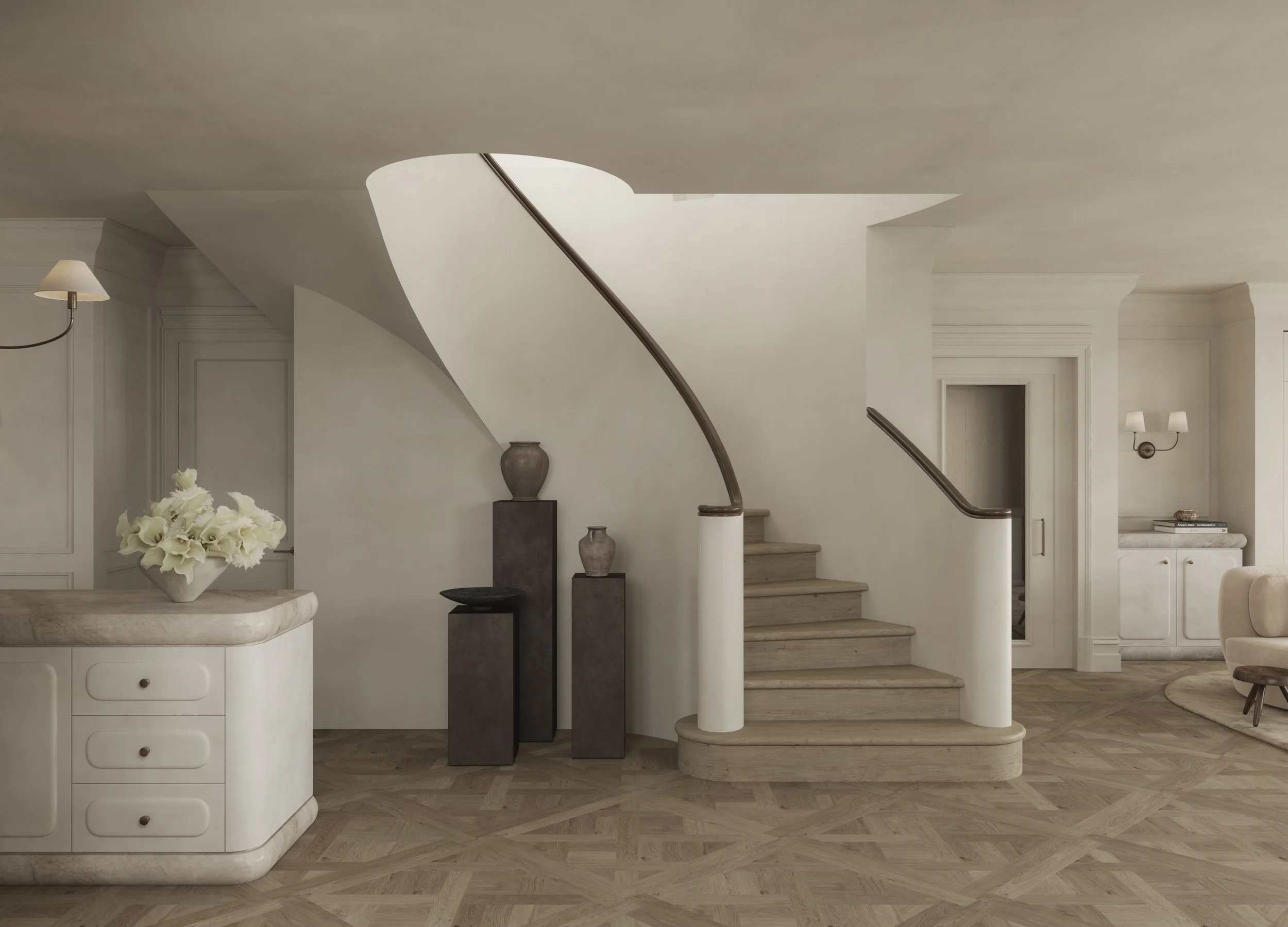 “L’Appartement Rêvé” is a study in understated Parisian modernism. A warm off-white interior defined by Taj Mahal marble, Versailles board flooring, and a high-gloss lacquer handrail. The palette is soft but intentional, creating depth through texture rather than contrast. Stone meets timber in a quiet tension between precision and patina, while reflective surfaces introduce subtle sharpness to the otherwise muted atmosphere. The aesthetic is clean, architectural, and quietly confident. A contemporary interpretation of classic Parisian elegance stripped of ornament but rich in material character.